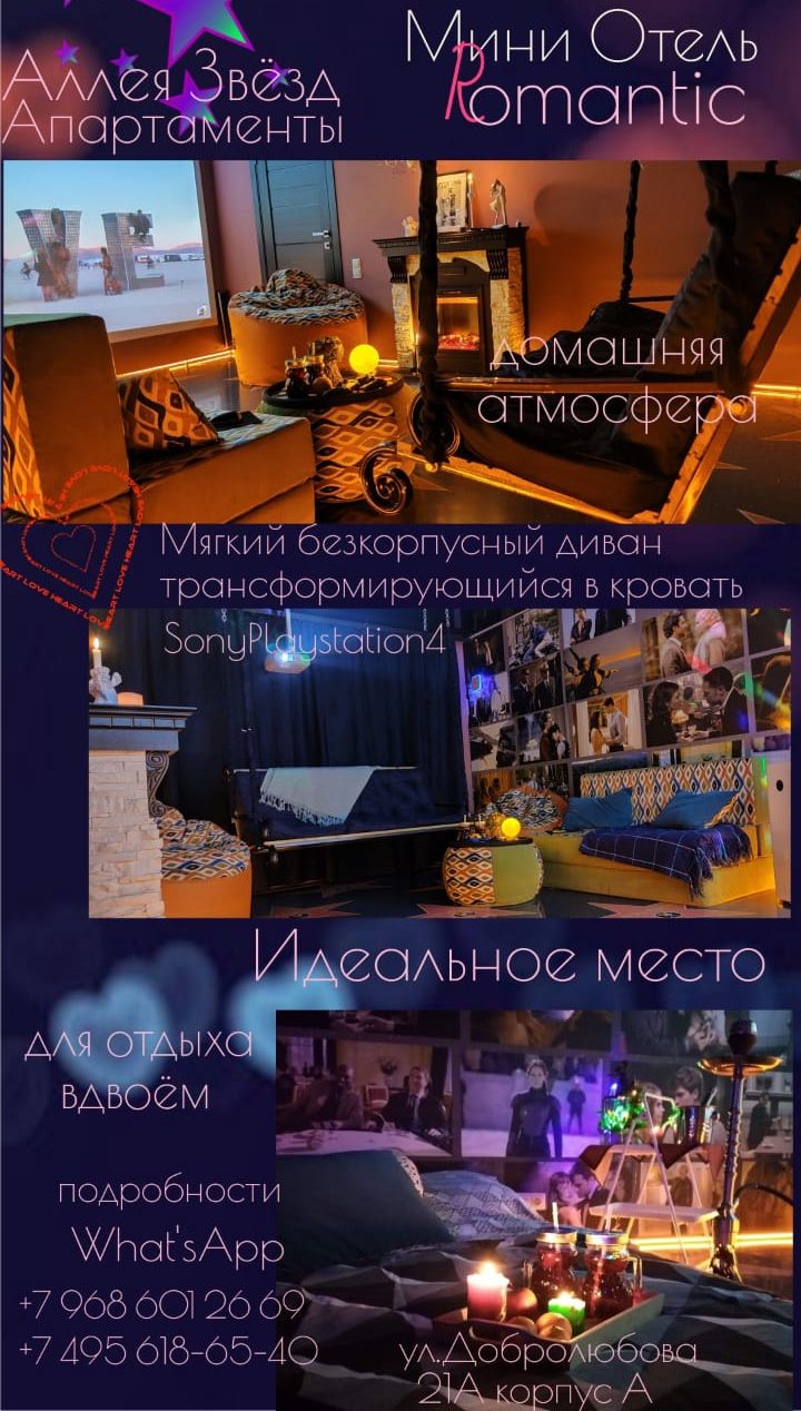 Эксклюзивный мини-отель с почасовой оплатой. Уникальные номера, созданные по смелым дизайнерским проектам. Полы в отеле наливные, потолки натяжные, обои художественные с 3D эффектом, эксклюзивная мебель.